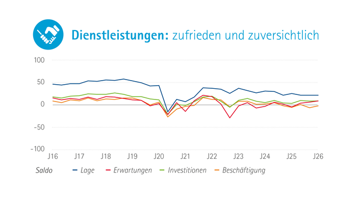 Die Dienstleister bewerten ihre aktuellen Geschäfte weiterhin als einzige Branche klar positiv – allerdings ohne weitere Verbesserungen gegenüber Herbst. Die Branche zeigt sich in der Breite zufrieden, mit einzelnen Ausnahmen wie der Logistikbranche. Für die kommenden Monate überwiegt die Zuversicht, die Erwartungen haben sich gegenüber dem Vorjahr deutlich verbessert. Besonders Finanz- sowie beratungs- und wirtschaftsnahe Dienstleister rechnen mit besseren Geschäften.