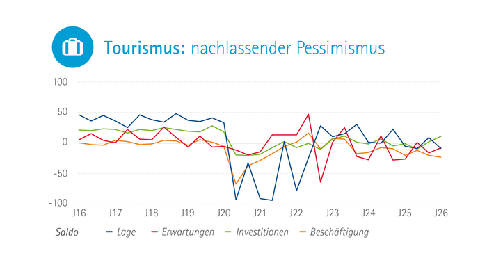 Im Tourismus sind die Betriebe unzufriedener als noch im Vorjahr, insbesondere in der Hotel- und Gastronomiebranche. Mit Blick auf die kommenden Monate nimmt der Pessimismus jedoch ab. Die Mehrwertsteuersenkung dürfte für Entlastung sorgen.