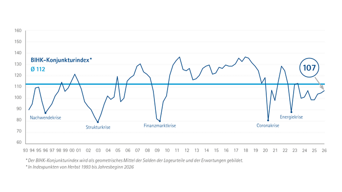 Die von der neuen Bundesregierung versprochene Wirtschaftswende bleibt bislang ebenso aus wie der angekündigte „Herbst der Reformen“. Ungelöste strukturelle Herausforderungen, hohe Arbeitskosten und eine anhaltend schwache Nachfrage bremsen das Wachstum aus. Der BIHK-Konjunkturindex legt gegenüber Herbst 2025 lediglich um zwei Zähler auf 107 Punkte zu und liegt damit weiterhin unter dem langjährigen Durchschnitt von 112 Punkten.